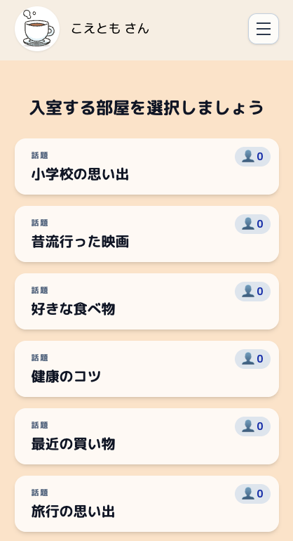 登録が終わると、ホーム画面が表示され、通話をする場合は「通話部屋を探す」を選択すると下図のように通話部屋の一覧が表示されます。各部屋には話題が表示されており、お好きなお部屋に入室出来ます。